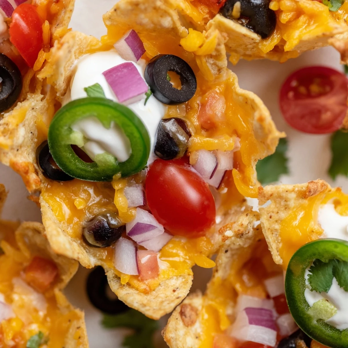 These bite-sized nacho cups transform classic tortilla chips into edible vessels by baking them in a mini muffin tin until perfectly crisp. Each cup gets generously filled with a blend of sharp cheddar and Monterey Jack, then topped with protein-rich black beans, sweet cherry tomatoes, briny olives, and a kick of jalapeño heat.
