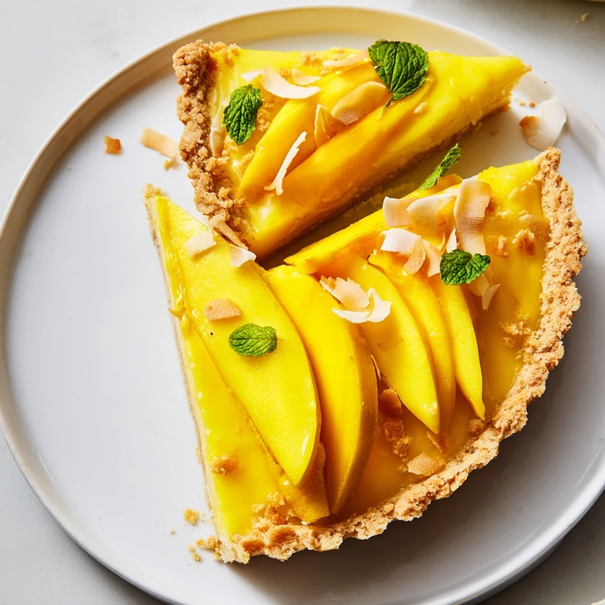 This tart is stunning on its own, but five minutes of thoughtful decoration takes it from home dessert to showstopper. I like to fan thin slices of fresh mango in concentric circles, then scatter toasted coconut flakes around the edges and tuck a few tiny mint leaves here and there for that pop of green.