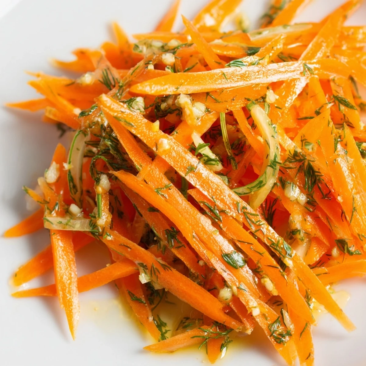 This vibrant marinated carrot salad combines crisp julienned vegetables with a bright lemon-herb dressing. The carrots soften slightly while absorbing the zesty marinade, creating a refreshing balance between tangy lemon, aromatic dill, and subtle sweetness from honey or maple syrup.