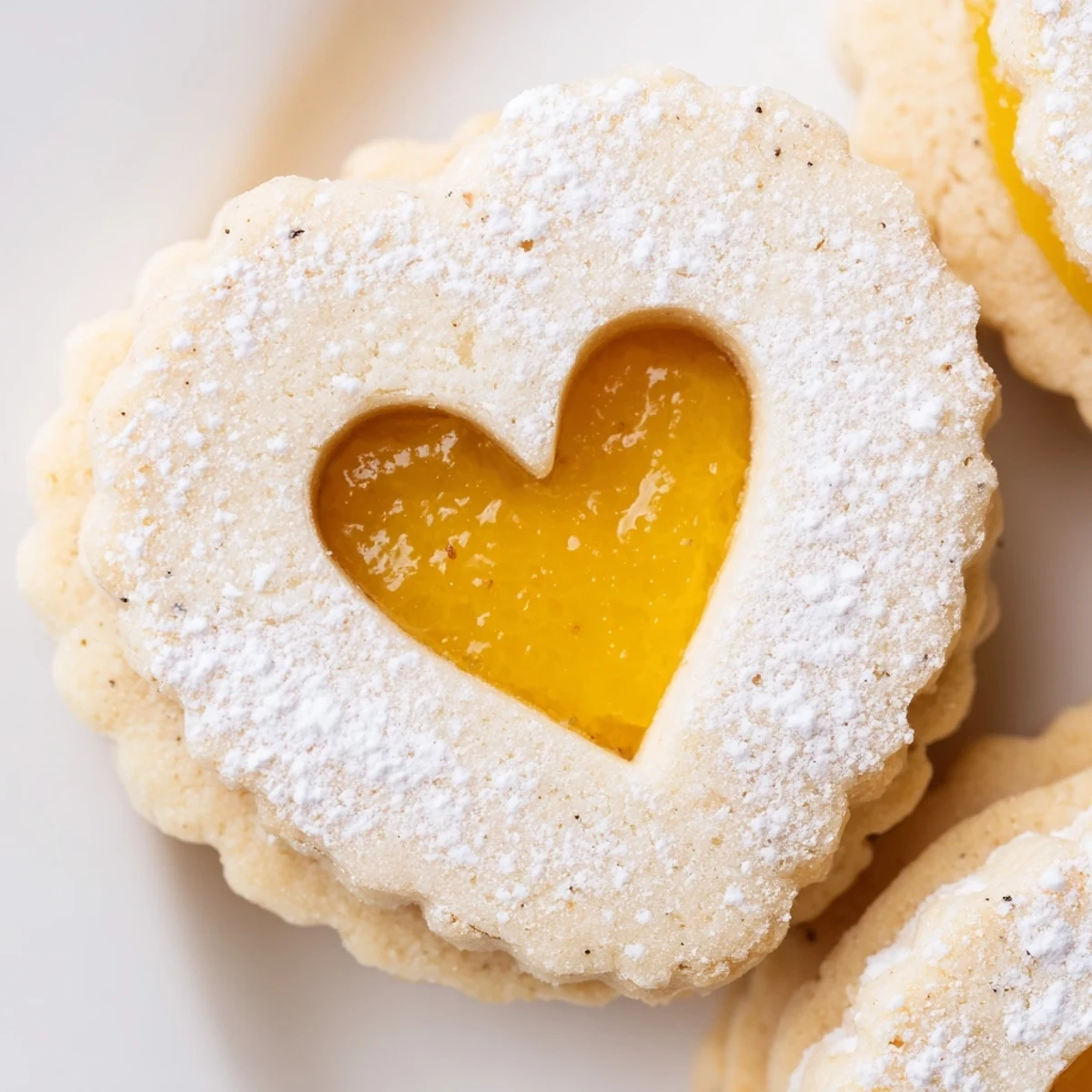 The traditional Linzer style features a windowed top cookie that reveals the filling beneath. This classic Austrian technique creates an elegant presentation and allows the colorful curd to show through the powdered sugar dusting.