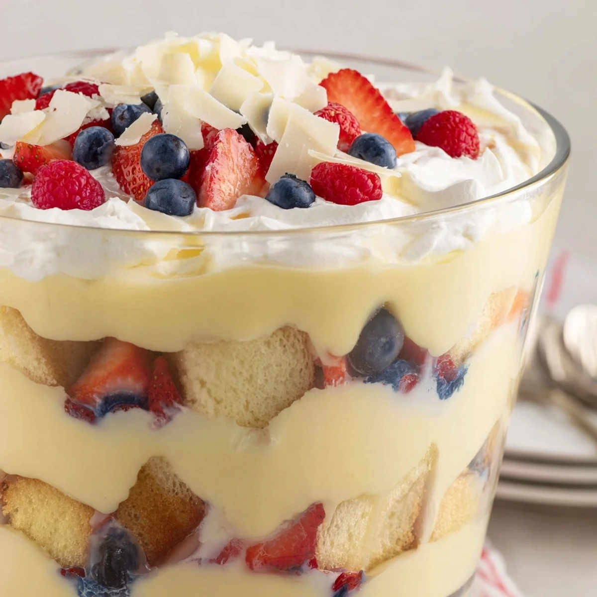 Last Fourth of July, as fireworks snapped in the distance and mosquitoes circled the patio, I found myself grinning into a giant glass bowl layered with red, white, and blue. There is something satisfying about gently pressing pillowy cubes of cake into creamy pudding, hands a little sticky as berries roll off the counter. The mixtape was all eighties, but everyone kept sneaking another spoonful of the trifle when they thought no one was looking. Now, whenever I make it, I can't help but associate the scent of vanilla and the cold creaminess with humid nights and cheerful company.