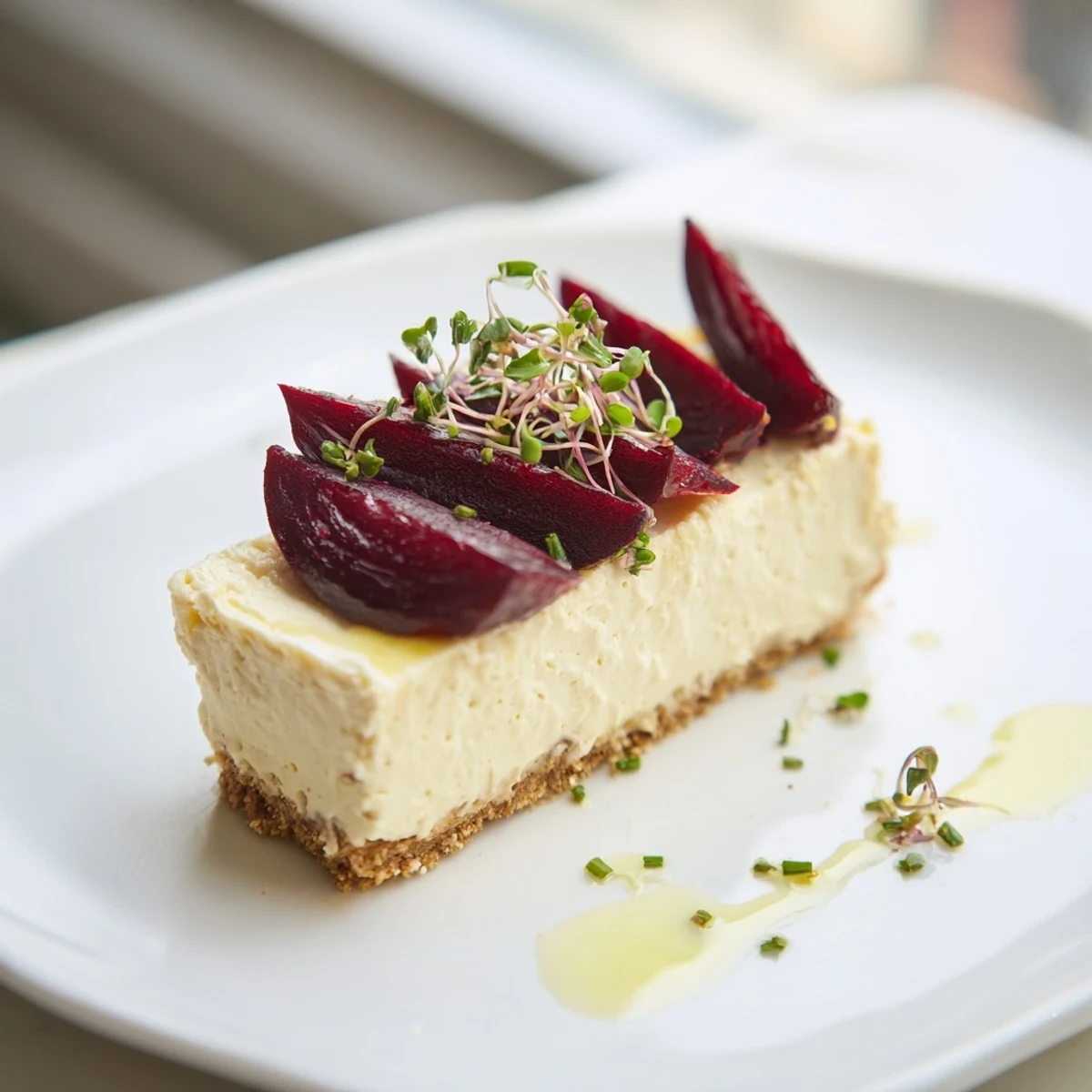 - Release the cheesecake from the pan, arrange the roasted beetroot wedges on top, scatter with fresh chives and microgreens, and finish with a generous drizzle of olive oil.
