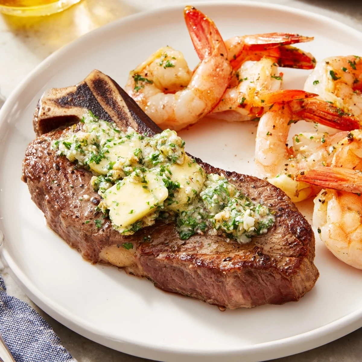 This surf and turf brings together tender ribeye steaks and juicy shrimp, each perfectly seasoned and seared to highlight their natural flavors. The dish is elevated by a rich garlic herb butter made with fresh parsley, lemon zest, and garlic, enhancing the savory profile. Cooking involves simple seasoning, quick searing in a hot skillet, and resting the steak for optimal juiciness. Garnished with lemon wedges and fresh parsley, this dish pairs well with roasted vegetables or fresh salad, ideal for a medium-difficulty special meal.
